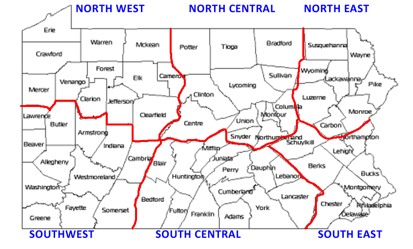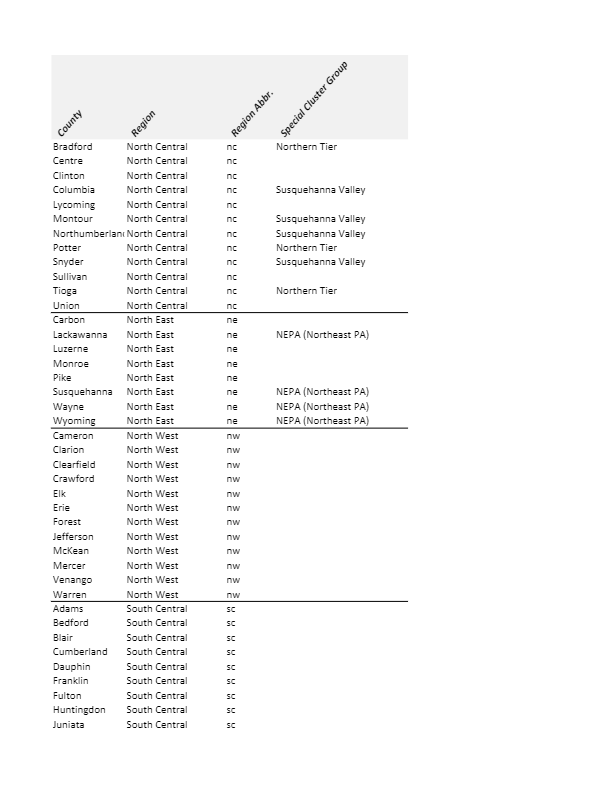The state is divided into six administrative regions geographically. In addition there are Three clusters of counties within those regions that have a name and shared leadership: NEPA, Northern Tier, and Susquehanna Valley. Regional Administrators can create “collections” of two or more counties and give them a name as needed.