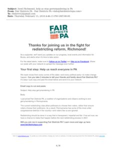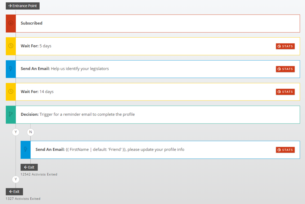 Five days after a new activist is subscribed, they will receive an email requesting that they complete their profile information online in order to identify their legislative districts more accurately. The page that the ask links to asks for street address and phone number and also asks for a Yes/No on volunteer interest. If they don’t respond to the first request, after two weeks they get a reminder.